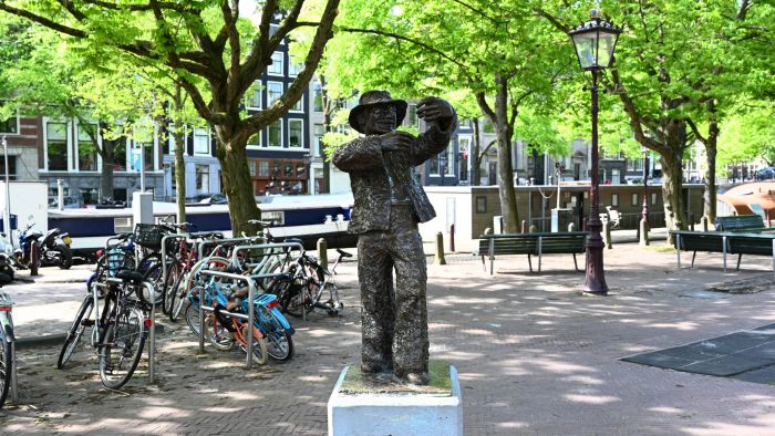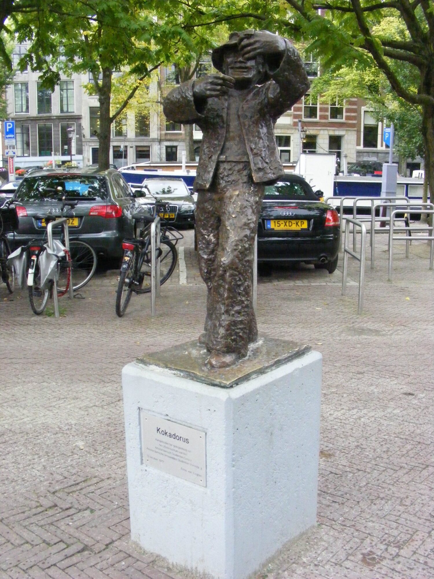 Met zijn armen hoog geheven prijst hij zijn waar aan of serveert hij net een rake observatie over het politieke toneel. Op het Amstelveld staat het bronzen beeld van Kokadorus, geboren als Meyer Linnewiel (1867–1934), een markante Joods-Amsterdamse standwerker en rasentertainer. Hij groeide uit van lucifersverkopend jongetje in de Kalverstraat tot ‘keizer der standwerkers’, geliefd om zijn humor, flair en scherpe tong. Zijn optredens begonnen met een klap op de gong, gevolgd door verhalen, maatschappijkritiek en pas daarna de verkoop van zijn waren. In 1906 vierde hij zijn 25-jarig jubileum als koopman, onder politiebegeleiding door mensenmassa’s. Het beeld van Erica van Eeghen, geschonken in 1977 door de Amsterdamse Vrouwelijke Studentenvereniging, vangt dat theatrale moment. Oorspronkelijk hield het beeld een stropdas vast, maar die brak eraf.