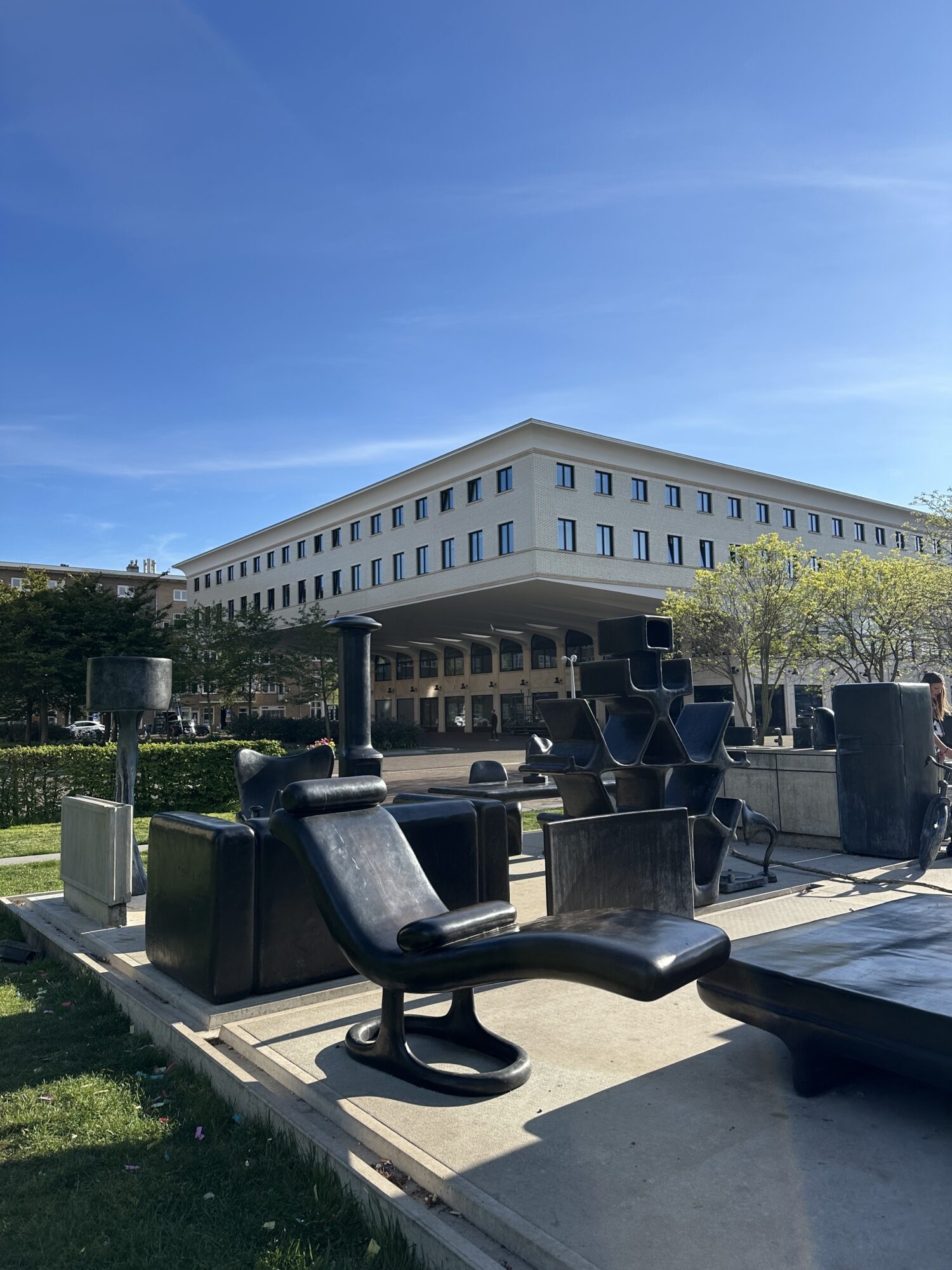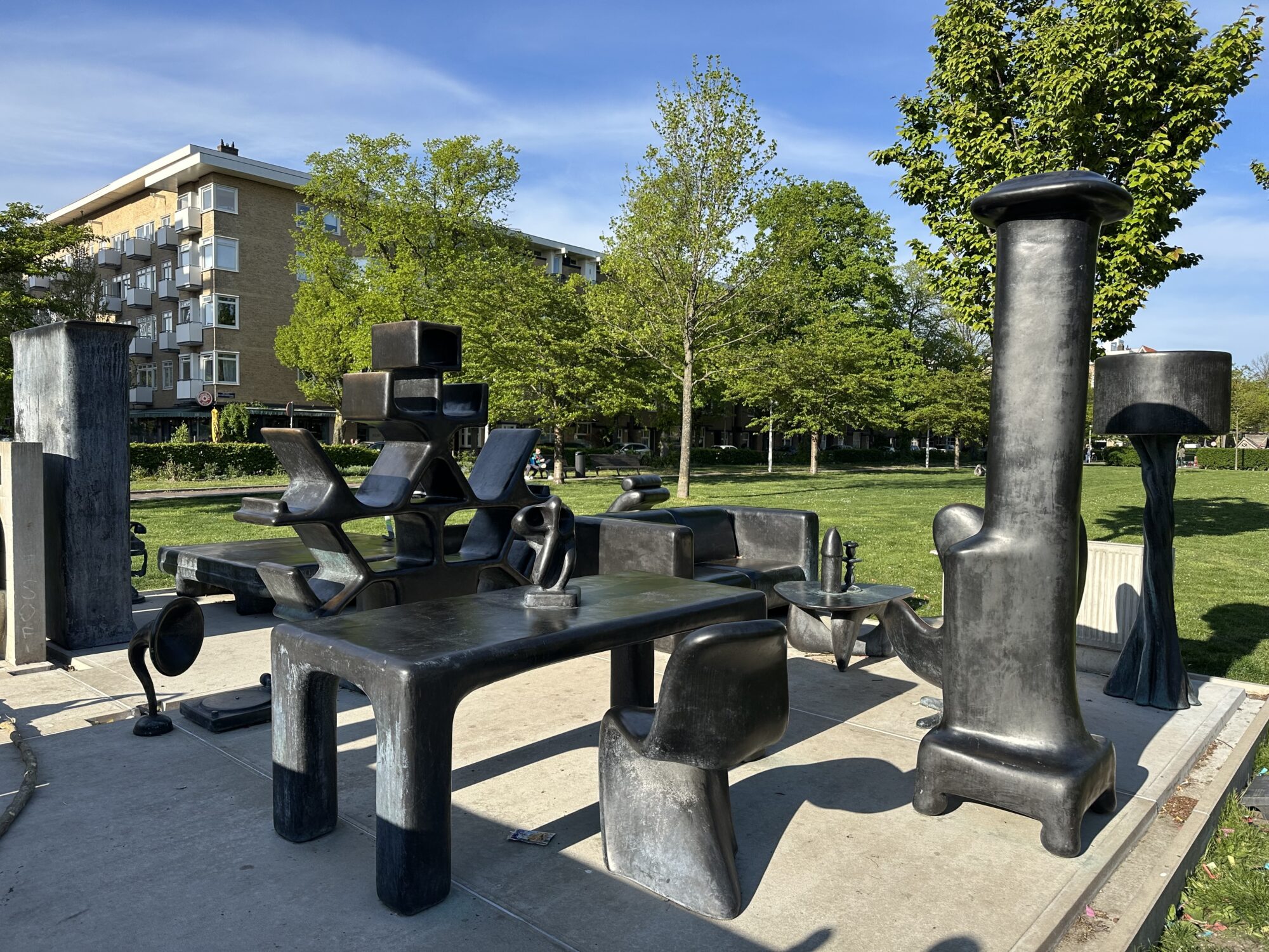At Stadionplein, Matthew Darbyshire designed a wall-less dream apartment in collaboration with local residents, crafted entirely from bronze and concrete. Its interior features, among other things, an IKEA Klippan sofa, a striking Sottsass bookshelf, a vintage telephone, and even a bicycle – all carefully selected from a digital catalogue.