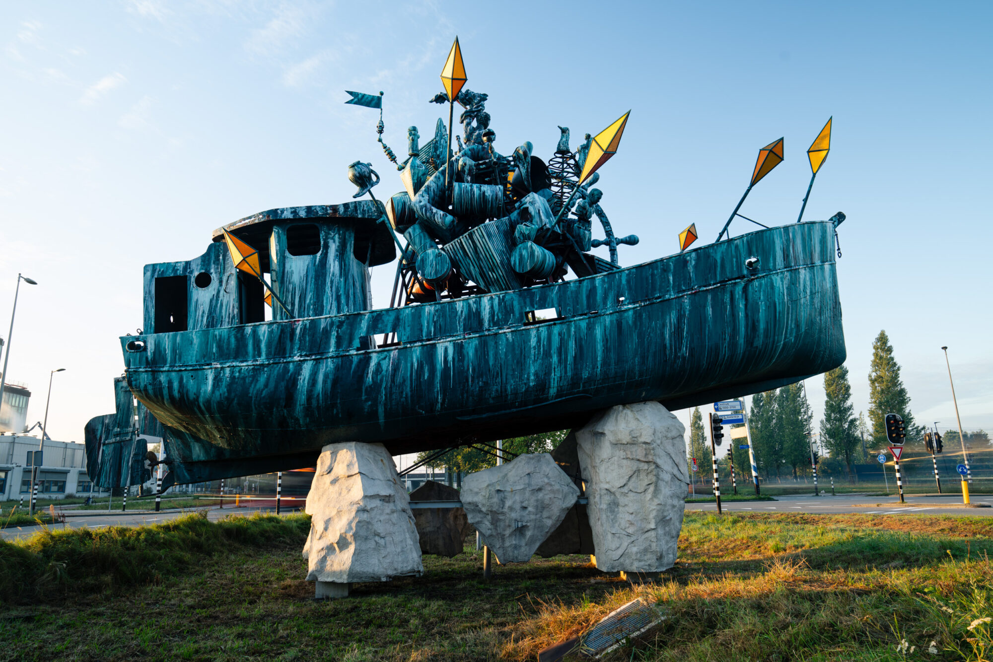 On the roundabout at Seineweg and Radarweg, at the edge of Nieuw-West where city and harbour meet, lies All Aboard, a new artwork by Hans van Bentem. A fishing boat, repurposed as a monument. Its hull is filled with ceramics, glass and steel – a collection of objects that refer to the transformation of the harbour area into a modern residential and working district. At night, the work transforms: light filters through the glass forms, the ship begins to glow.