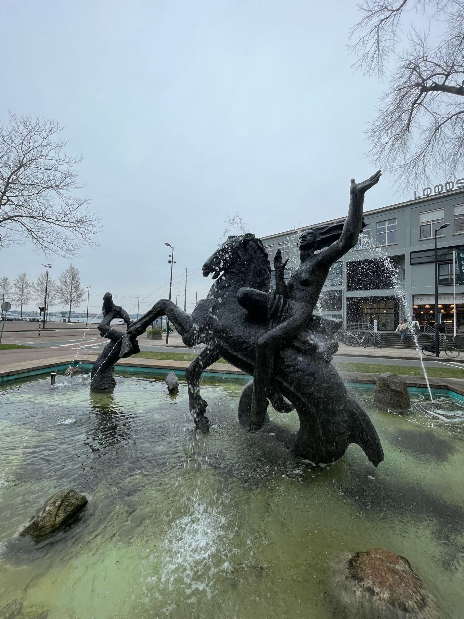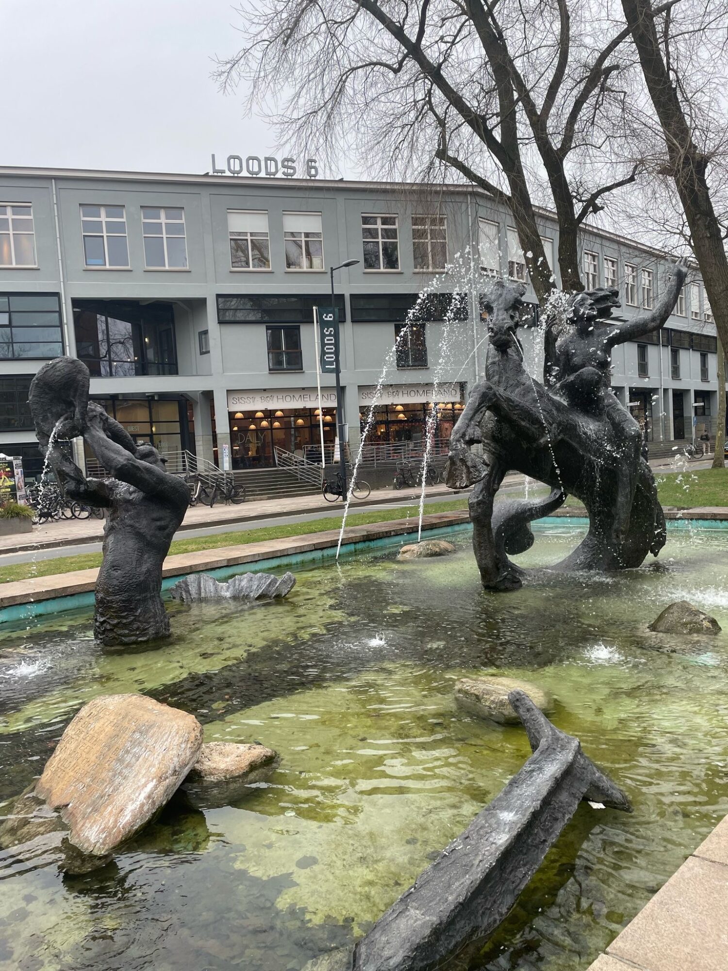 At Azartplein, a sea goddess rises from the water: Amphitrite, with flowing hair and raised arms, rides a rearing hippocampus — half horse, half fish — while her son Triton lifts a conch shell to his lips. The bronze fountain, surrounded by boulders and spraying water jets, radiates maritime strength. Originally gifted to the KNSM board in 1956, the work drifted into obscurity until former employees brought it back to the KNSM island in 2009 after years of fundraising.